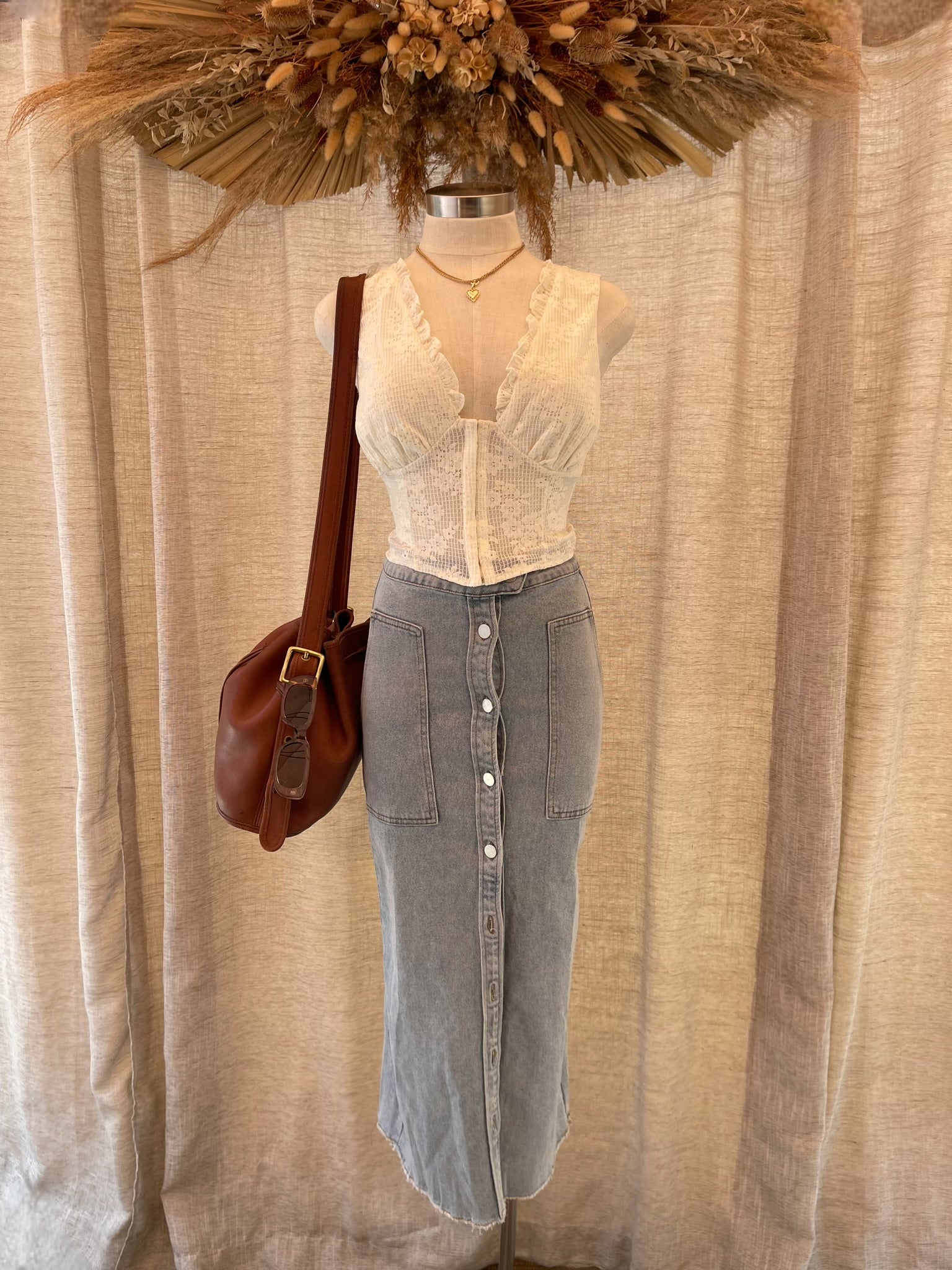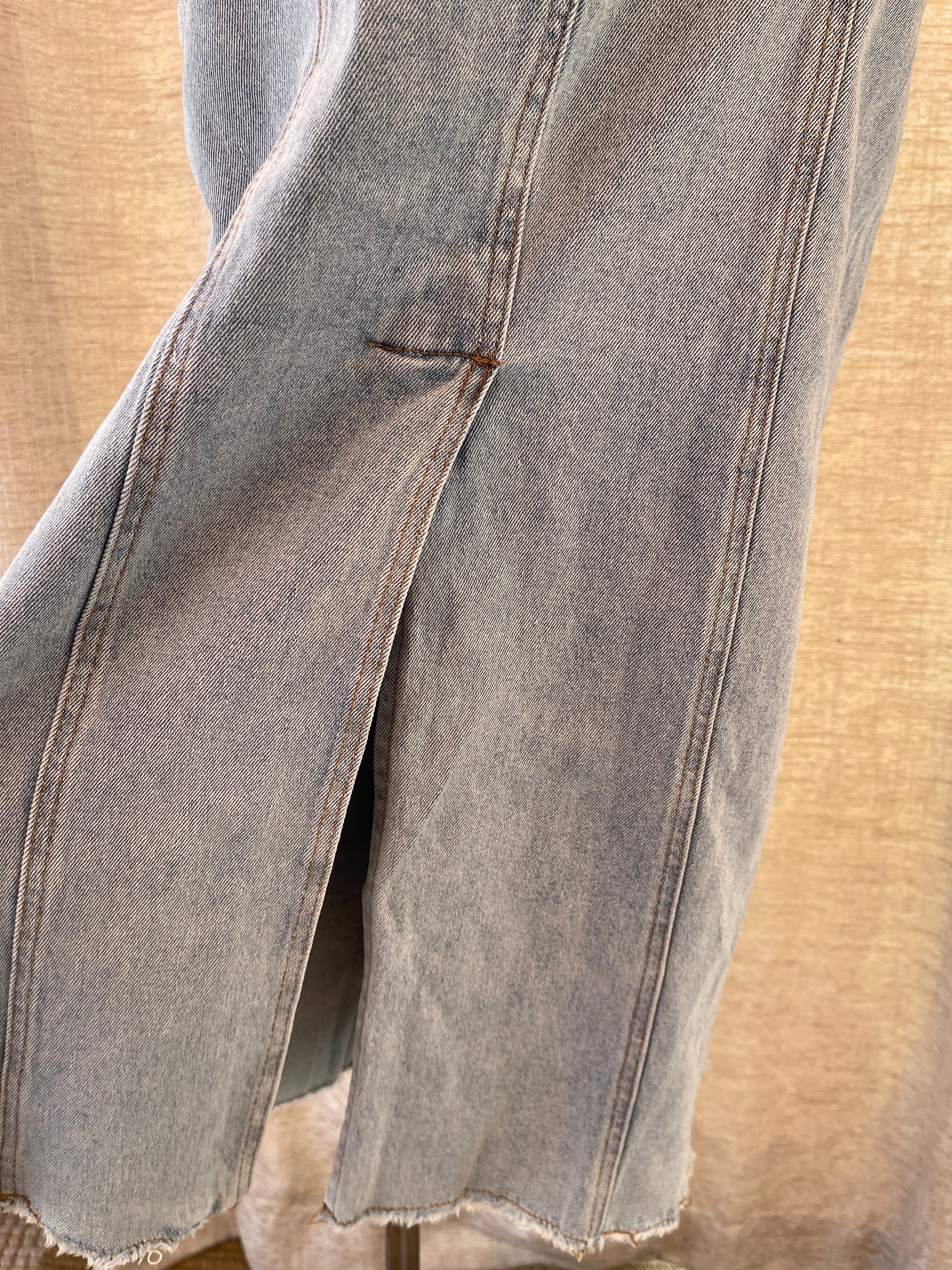 Button down denim maxi skirt. Trend setter can be worn dressed up with heals or down with shoes or boots. Has a slit on the back. Fits true to size, has a bit of stretch.