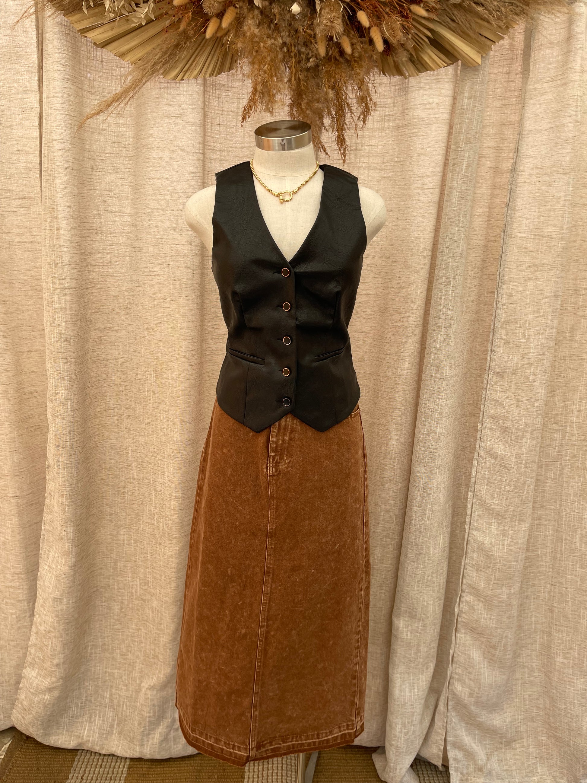 A staple rebellious piece. A moto-inspired vest with a fitted silhouette with seaming and snap buttons at the front. Fits true to size.