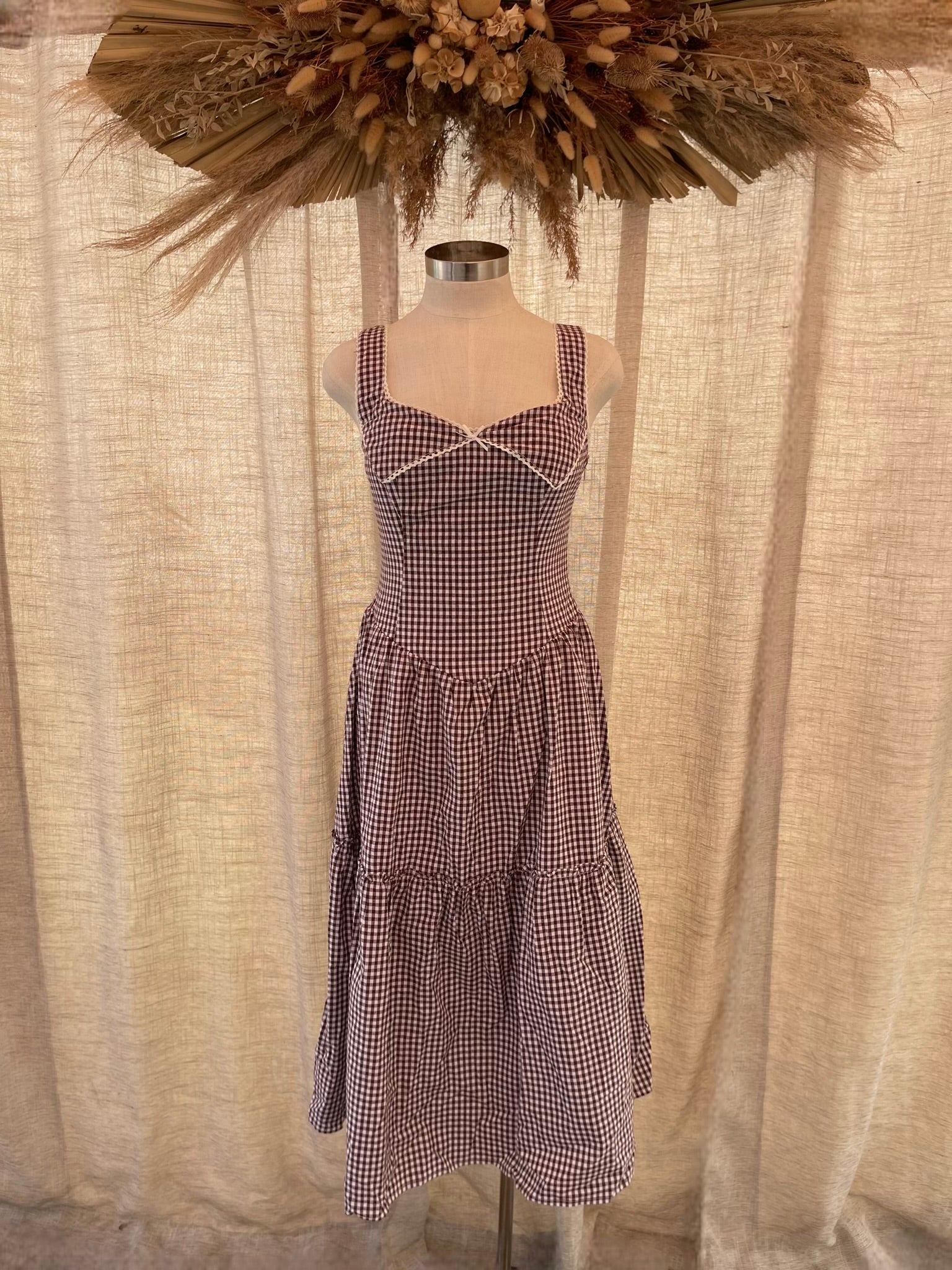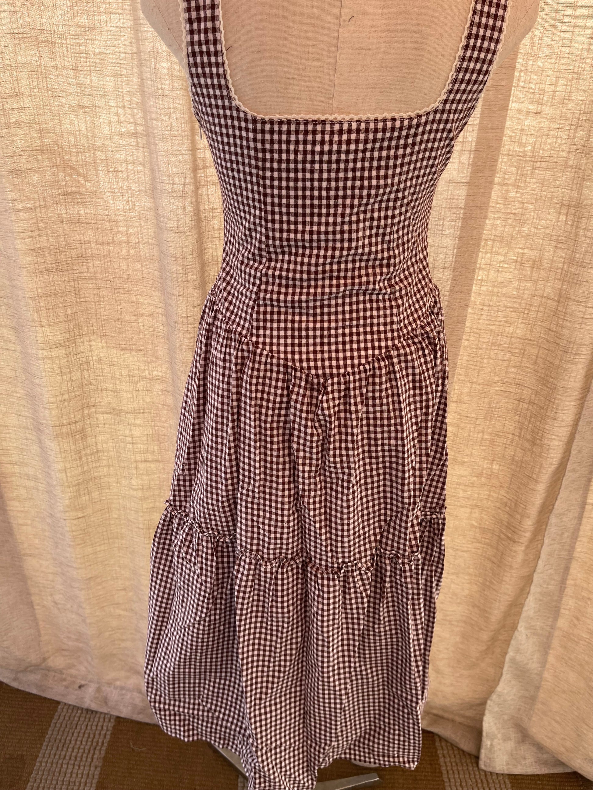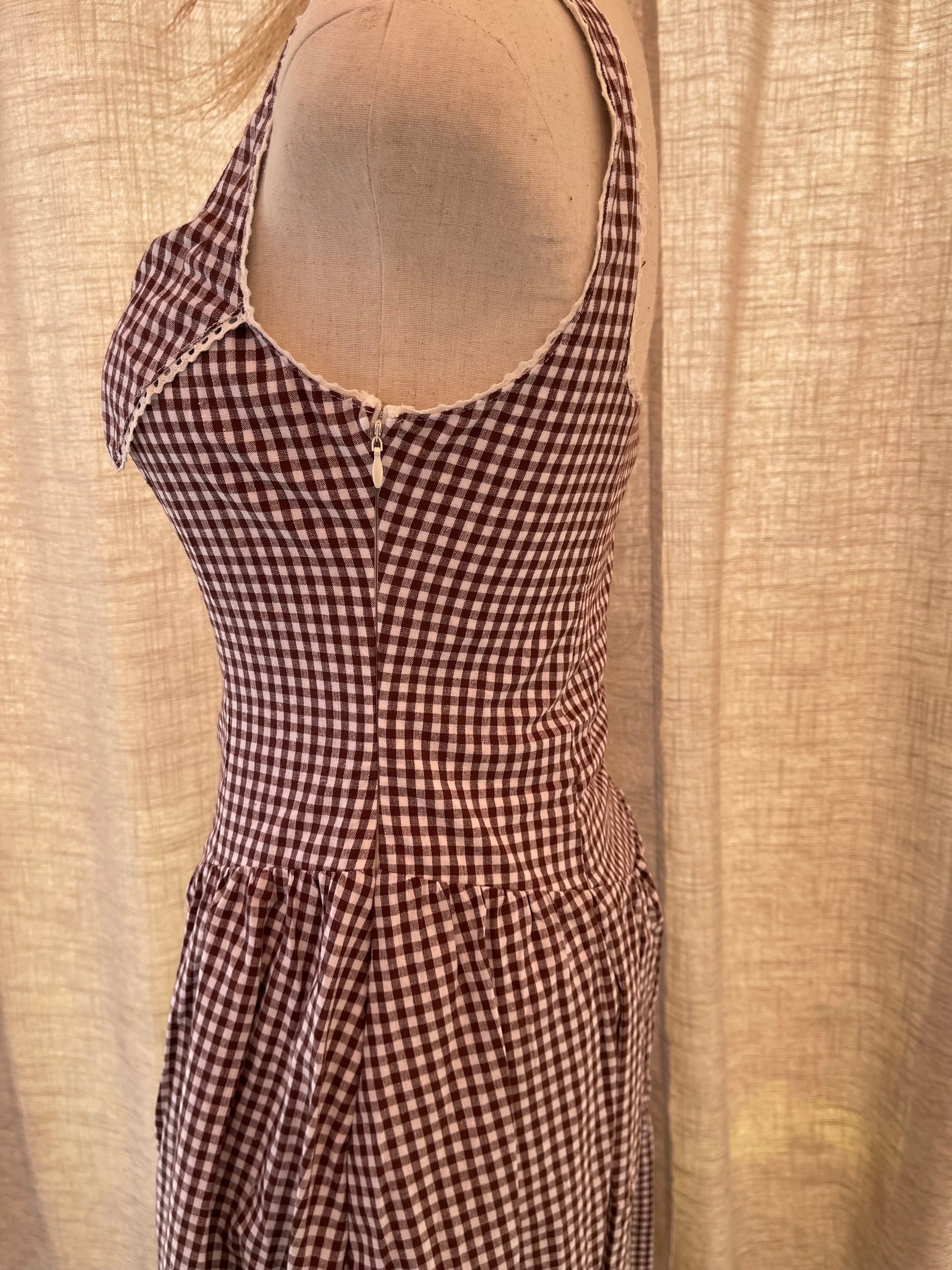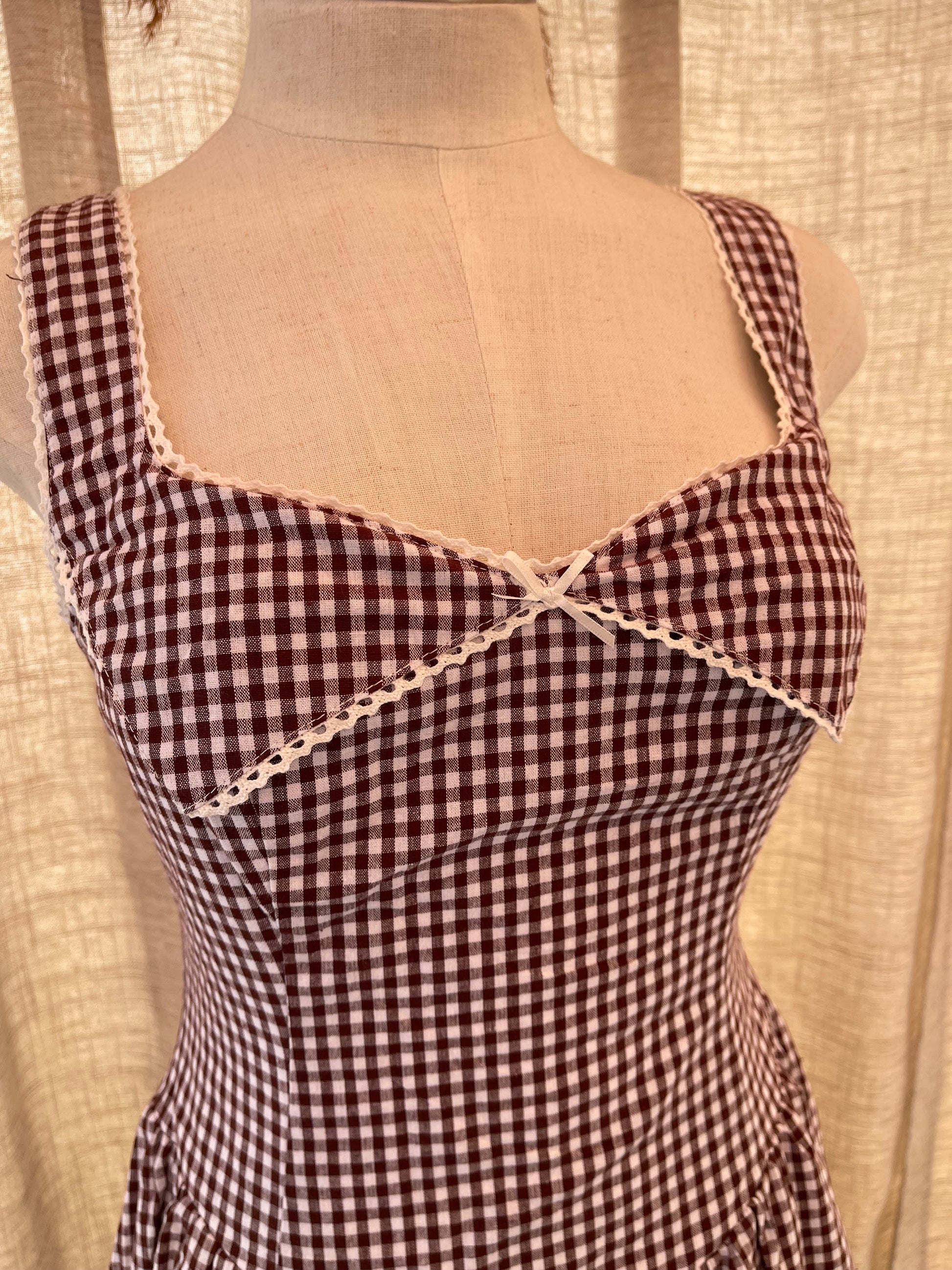 Your countryside gingham dress of your dreams. Features a Peter Pan collar, satin bow with lace trimming and zipper on the side. Pair it with boots, flats or sneakers for a casual look. It is lined, the dress itself does not stretch only the lining. Fit is true to size.