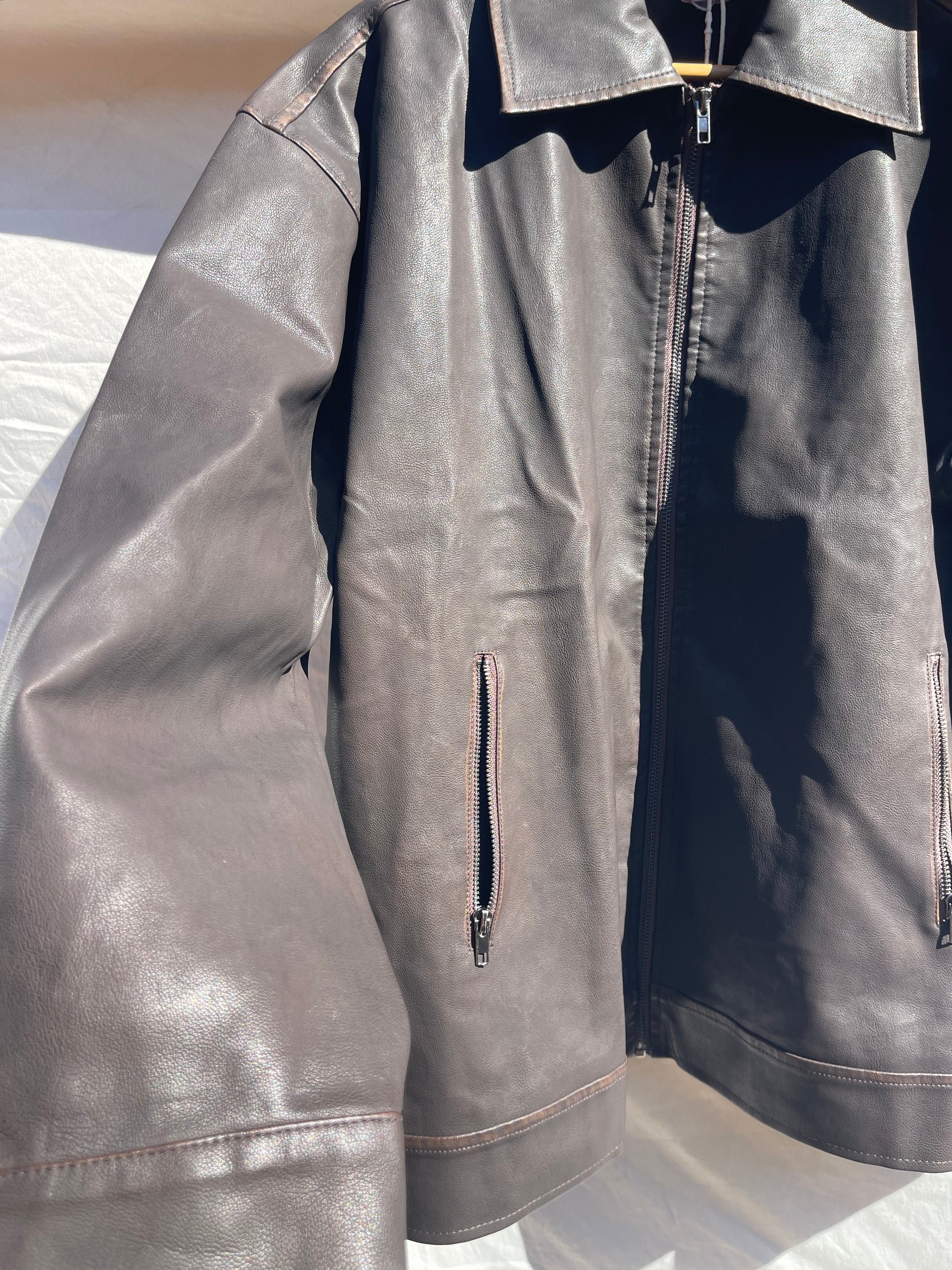 Vintage look faux leather jacket. This piece never goes out of style, definitely a must in your closet. Has a very oversized fit, recommended to size down but if you like the oversized look then stick to your size. Model is wearing size small.