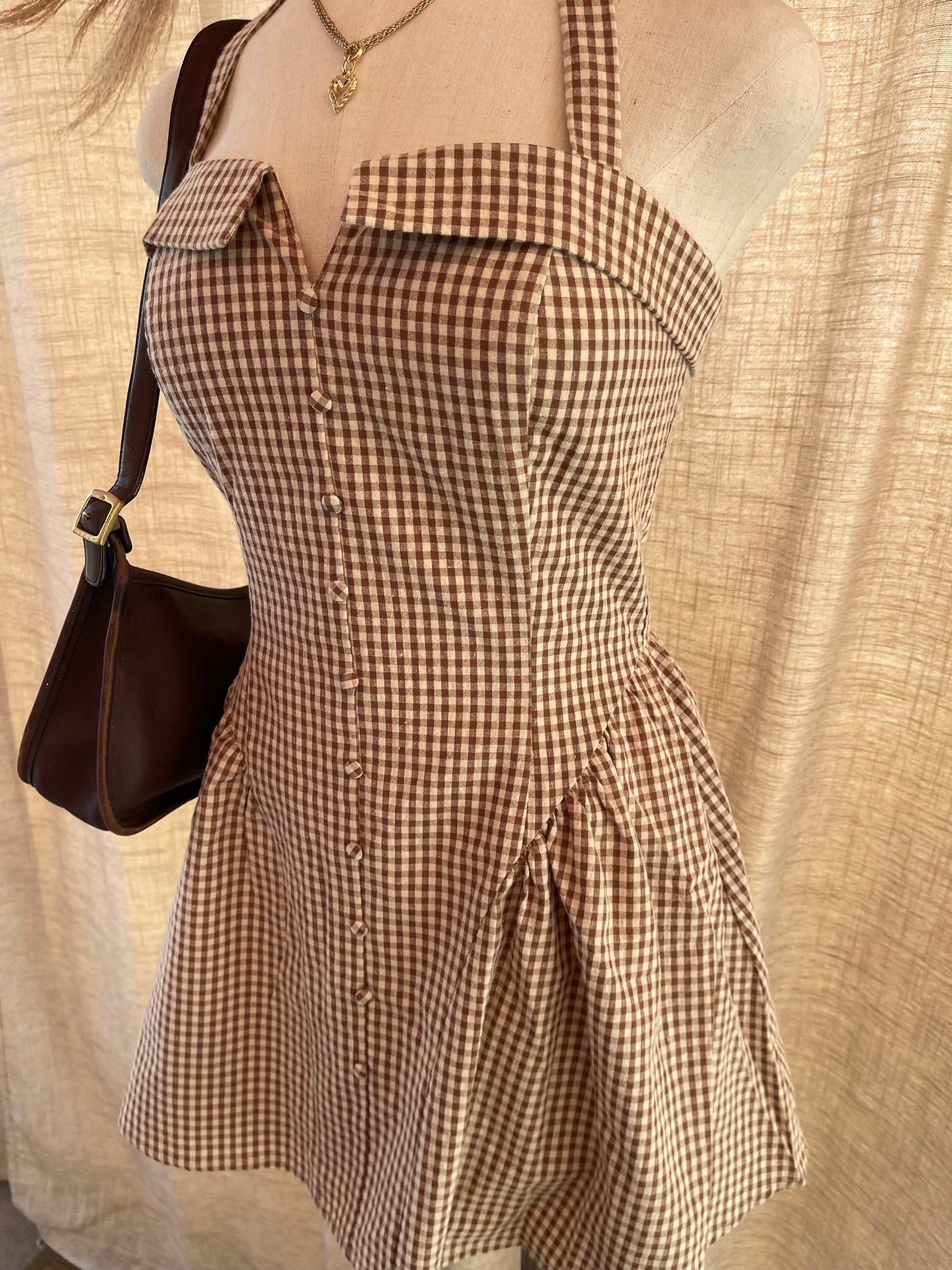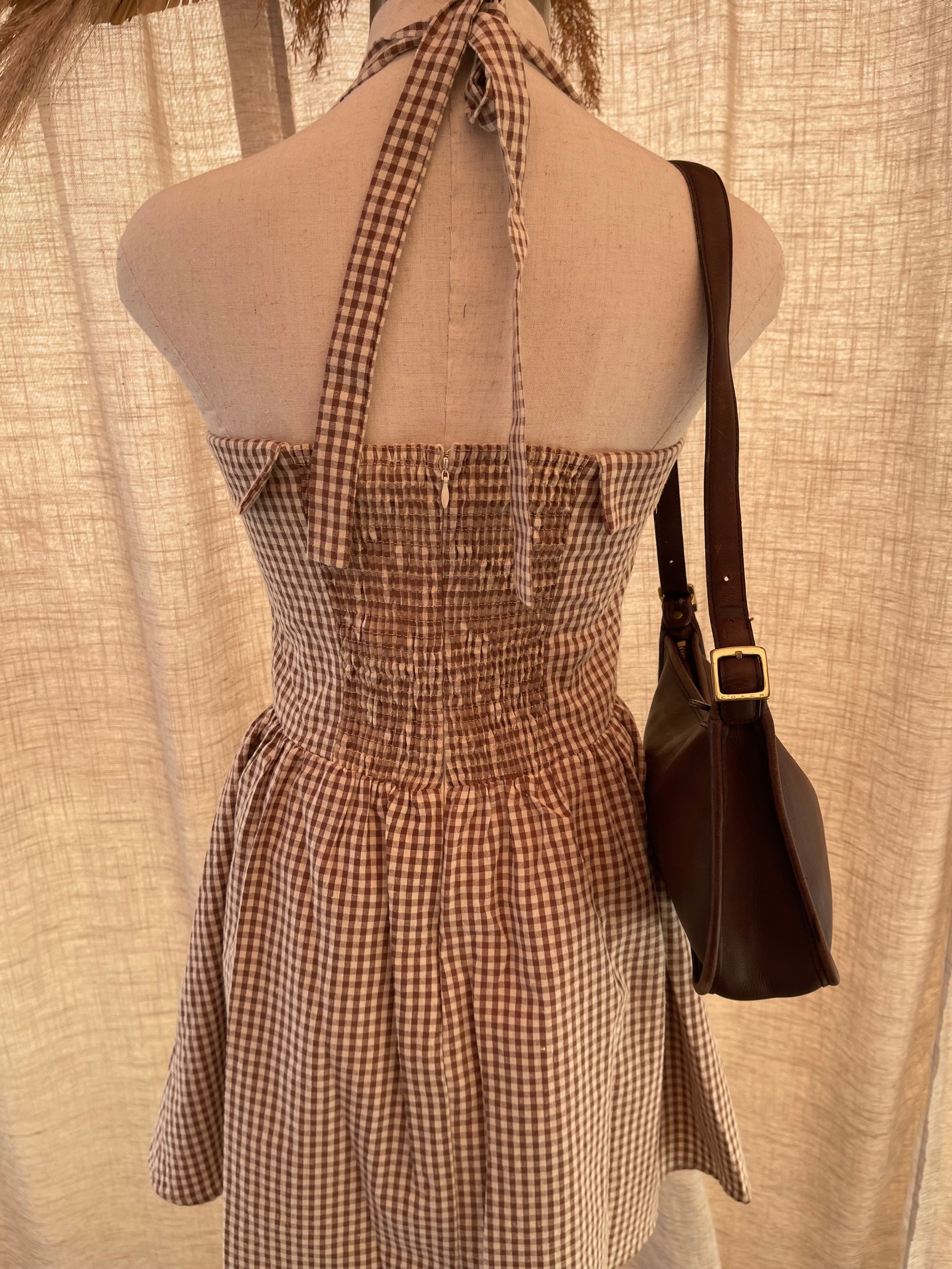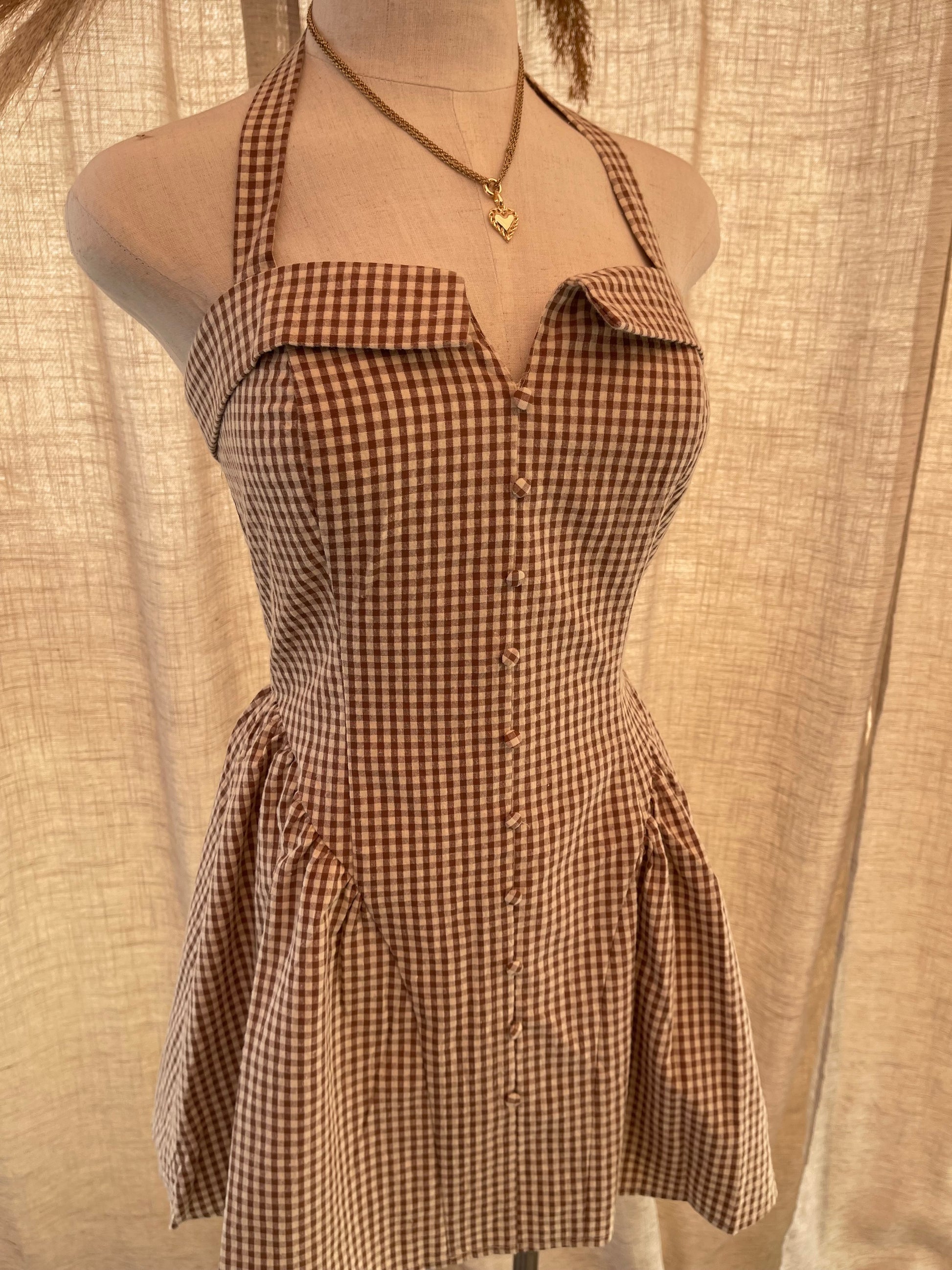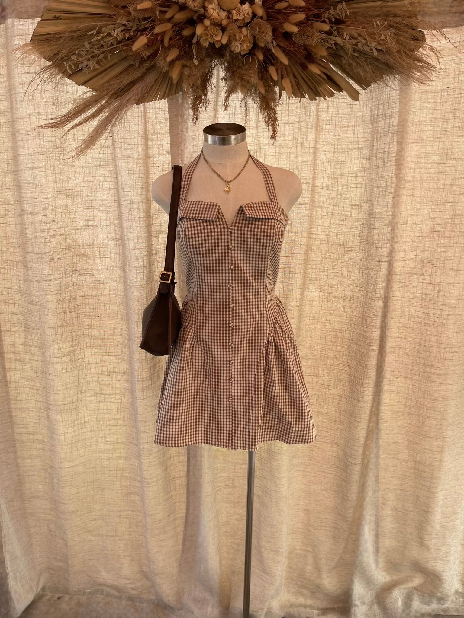 Classy and flirty gingham dress, pair it with boots for a western look or heels. Featrues a halter neck with buttons and a smocked back. Fits is true to size, if you are 5'7 or taller suggest to size up for length.
