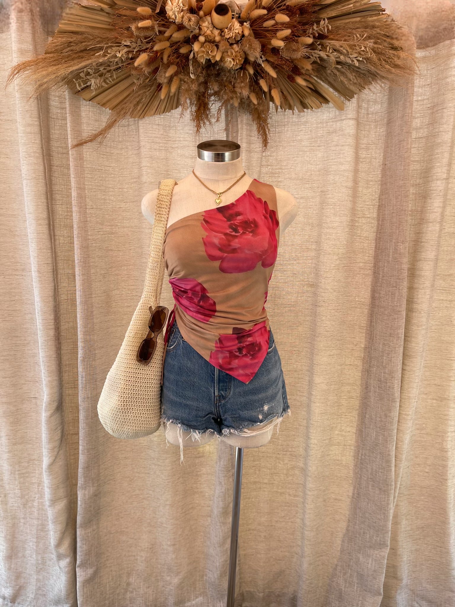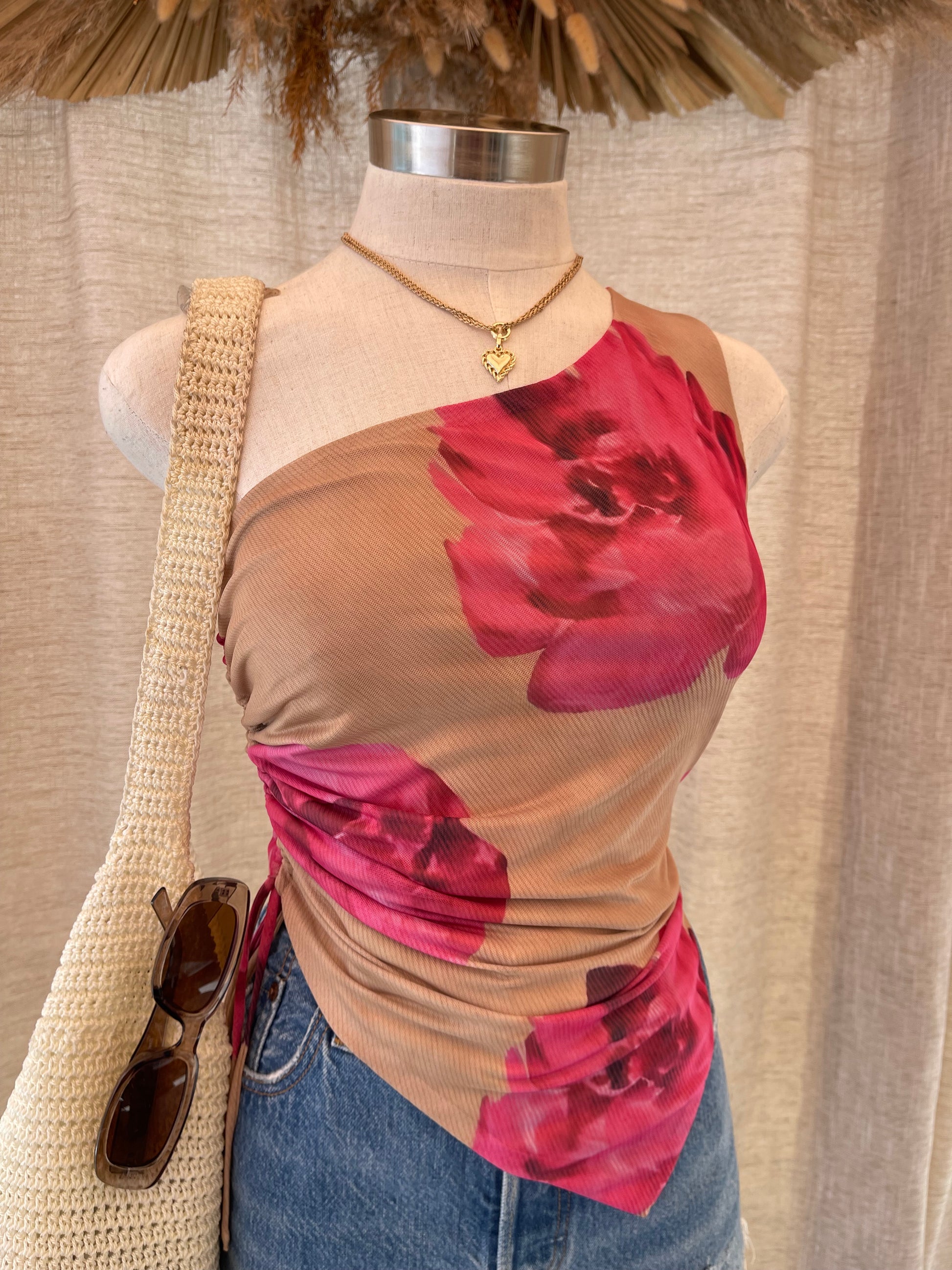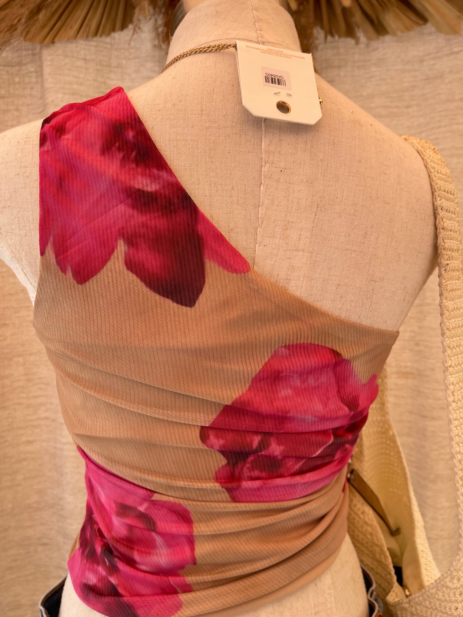 One shoulder asymmetrical ruching mesh top. Lined not see through. Has a ruching string on the side to make it crop or regular fit. A bit of a stretchy material. Fit is true to size.