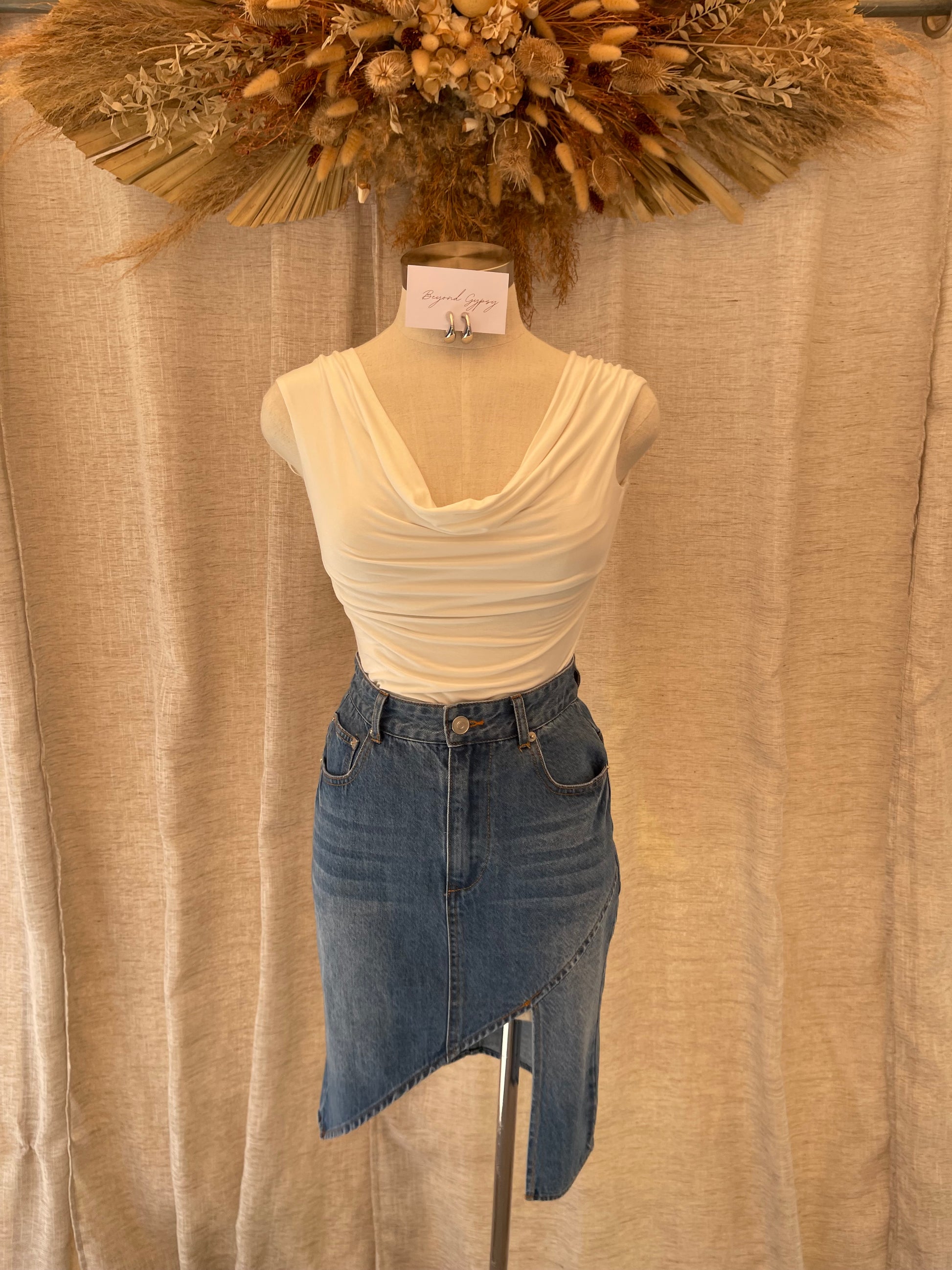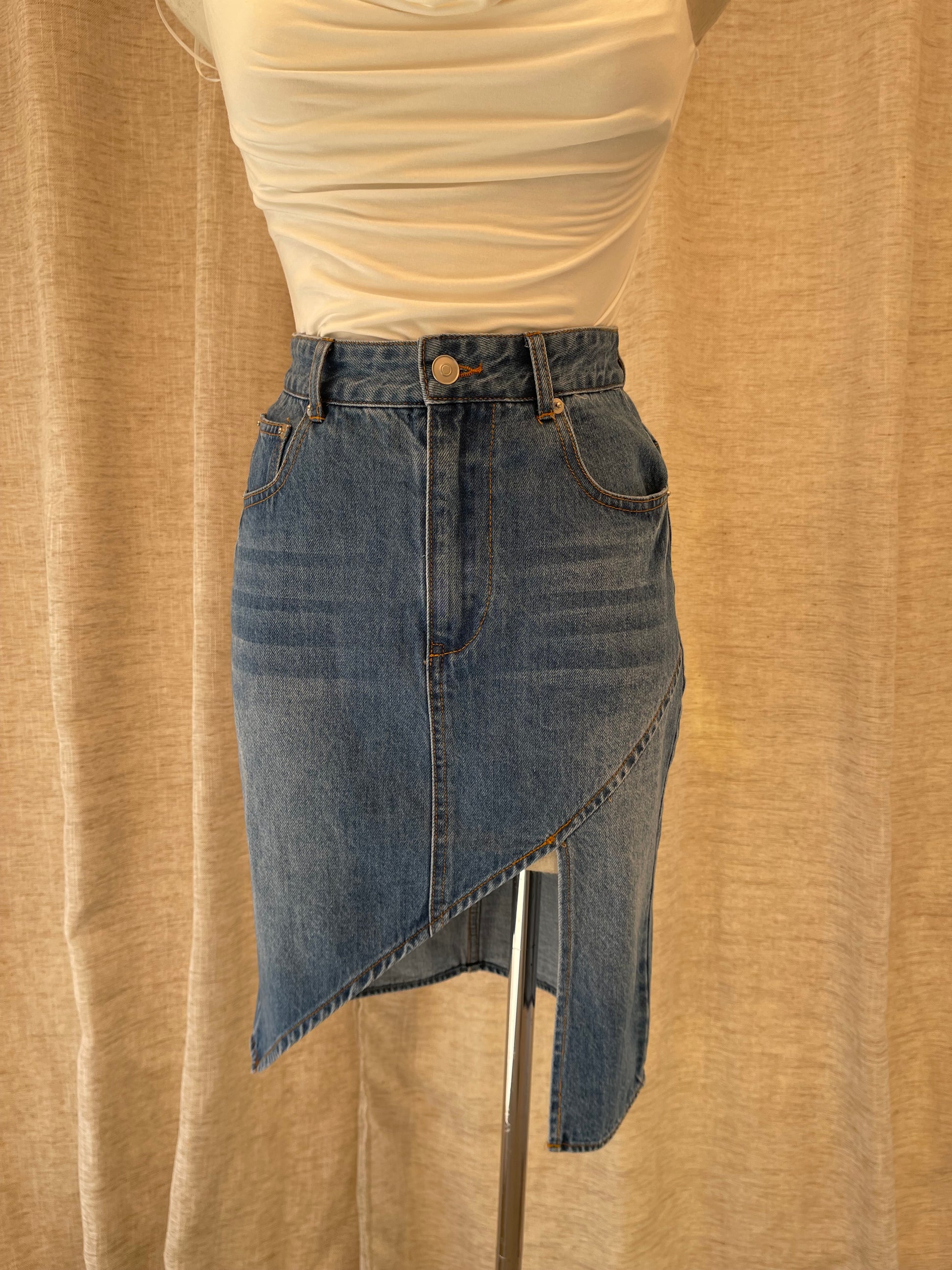 Must have asymmetrical skirt that will turn heads with every wear. Has a low slung wrap silhouette. Button and zipper closure. Fits true to size.