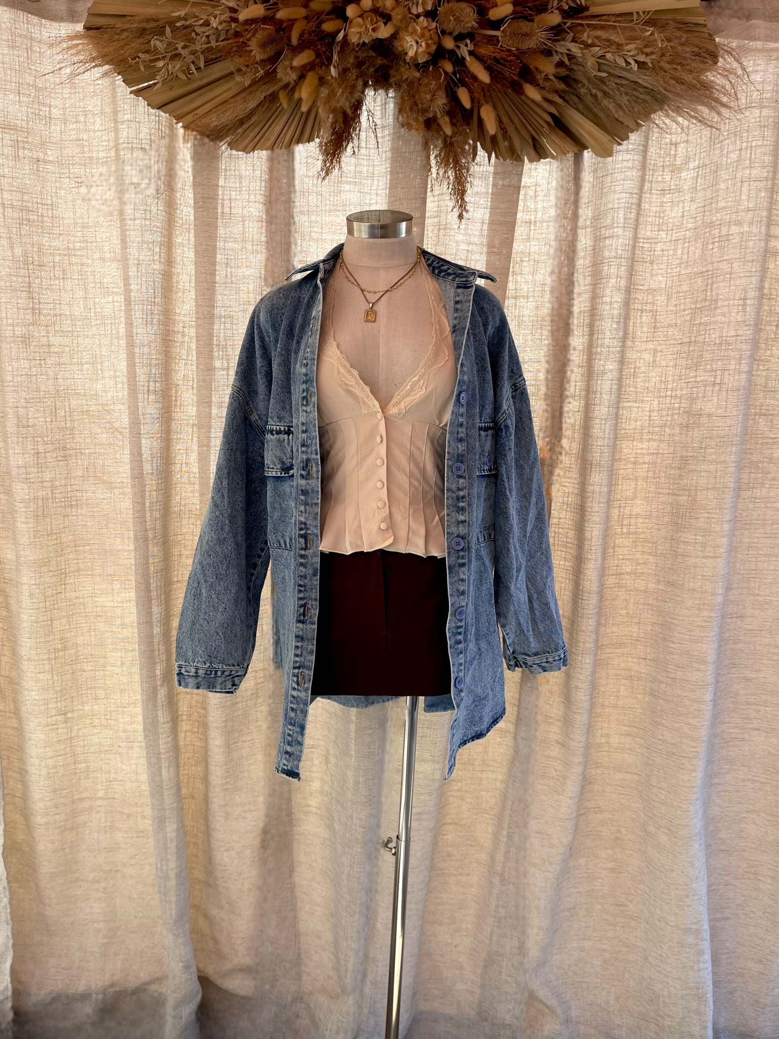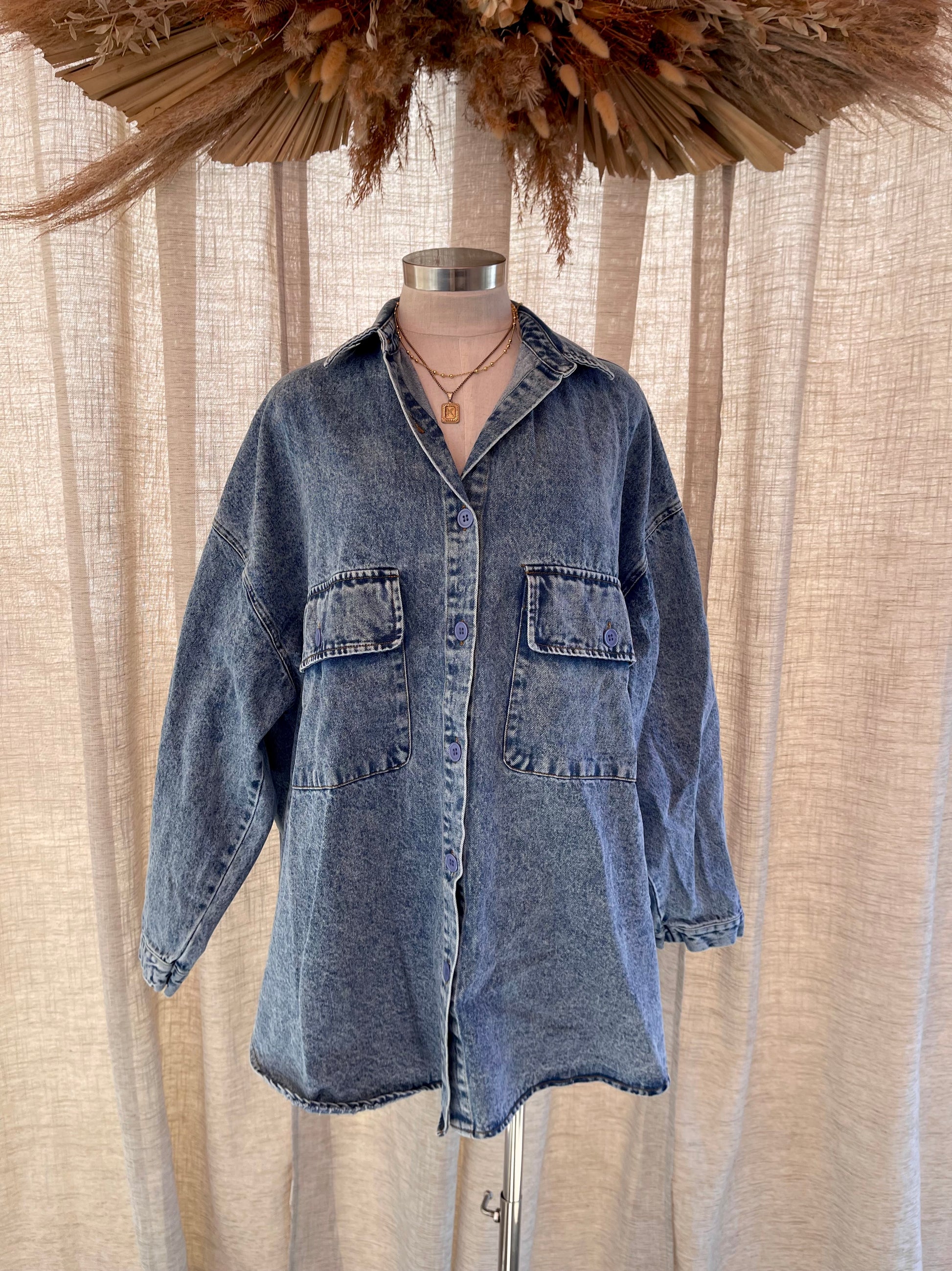 Nothing better than a denim shacket that is oversized. Can be worn as a dress if your 5'4 and shorter, pair it with tights and high boots or wear it just as a jacket like the mannequin. Fit is VERY oversize. ML FITS UP TO 3X.