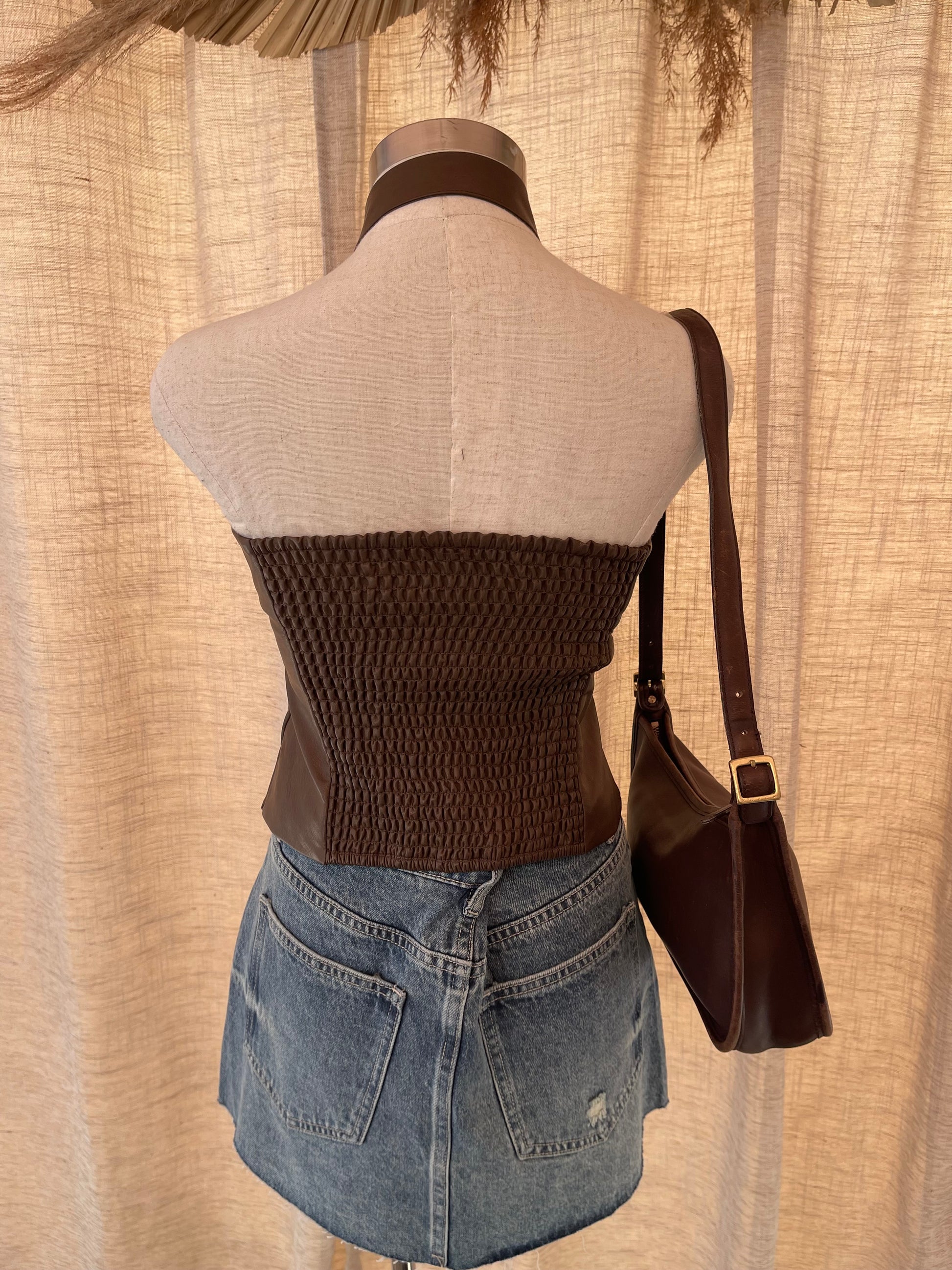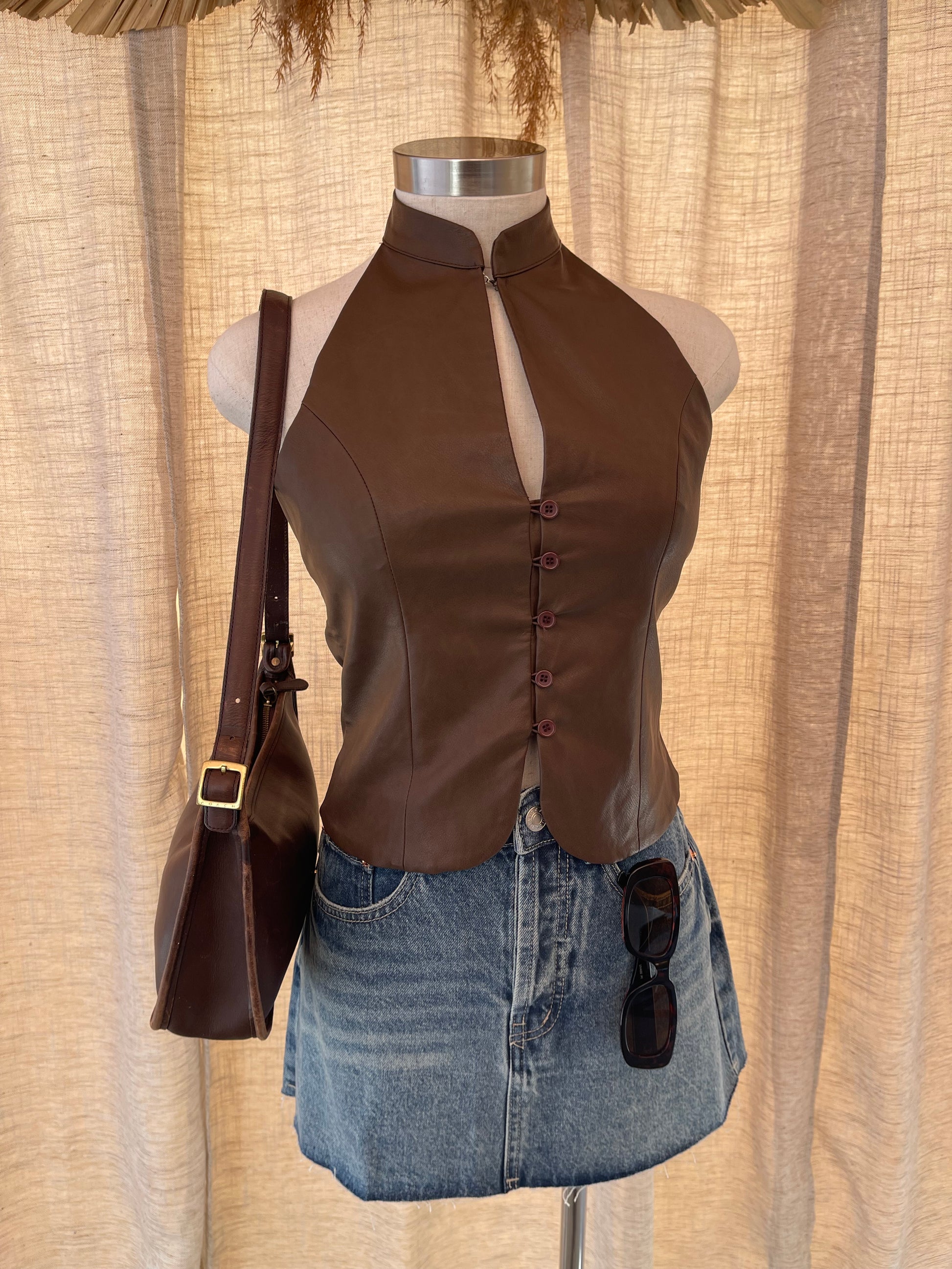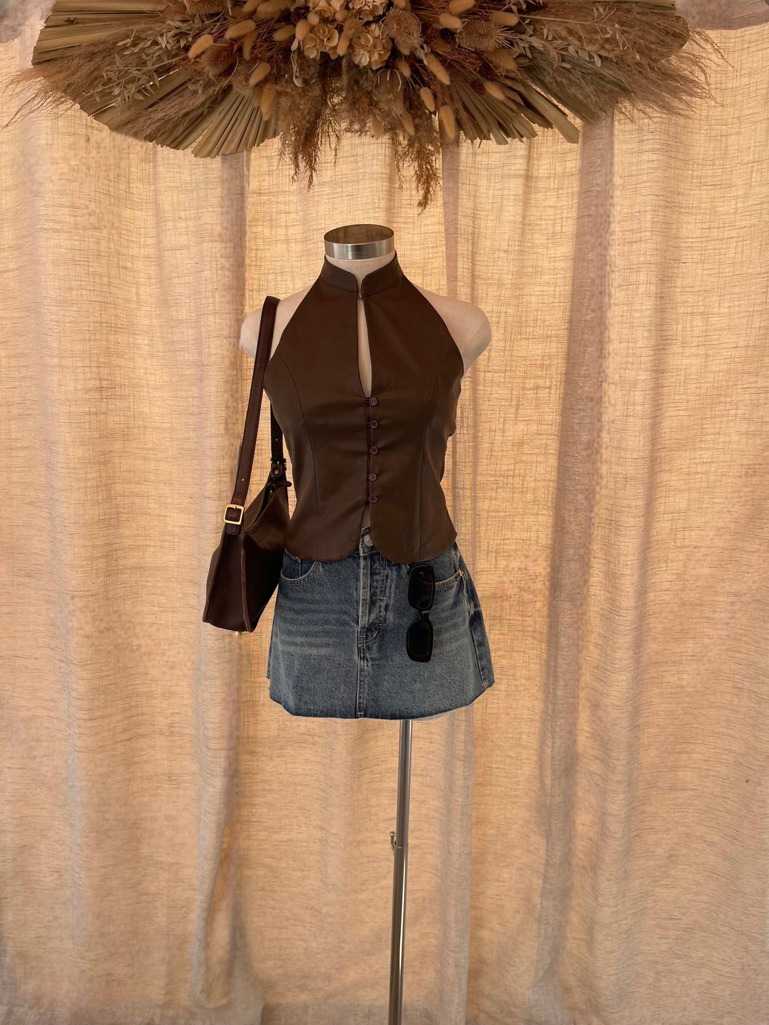Your next level up top for your next outing. Features a sleek mock neckline and front button closure. Has a smocked stretch back. Fit is true to size. Does have stretch. TOP ONLY.